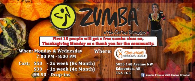 As a thank you to the community, Zumba Carina Brandao has offered the first 15 people on Thanksgiving Monday (October 9, 2017) a free Zumba class. See attached photo for more details. Be sure to share with family and friends!