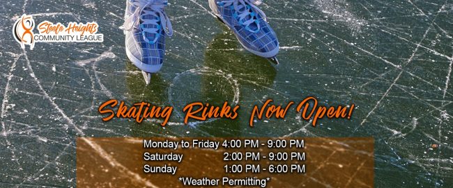 SHCL – Rinks Open Now! Monday to Friday, 4:00 PM – 9:00 PM Saturday, 2:00 PM – 9:00 PM Sunday 1:00 PM – 6:00 PM *Weather Permitting* Rink shack open when Steele Heights staff or volunteers able to accommodate. If you would like to volunteer, please contact us.