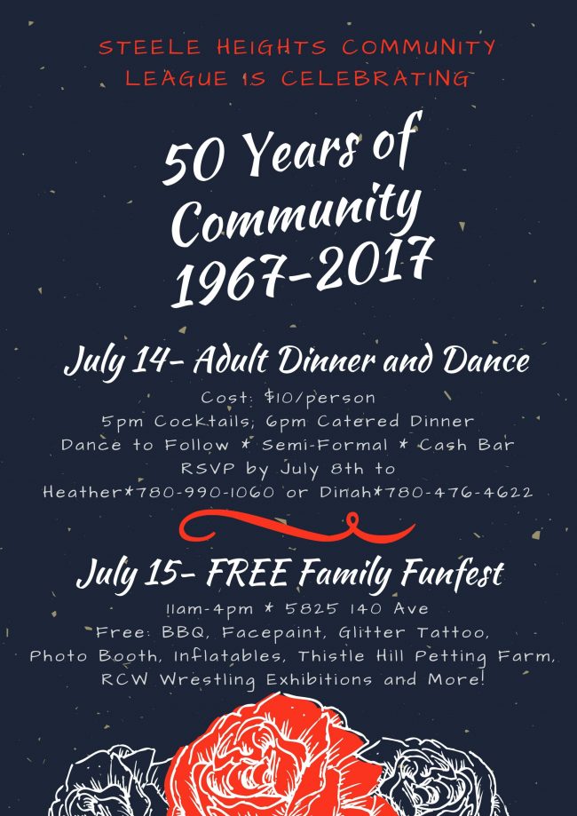 In celebration of Steele Heights Community League’s 50th Anniversary, all residents located within our boundaries of, 66 Street on the West, 144 Avenue on the North, 50 Street on the East, and 137 Avenue on the South are eligible to a free community league membership for the 2017/2018 year. Be sure to check out our…