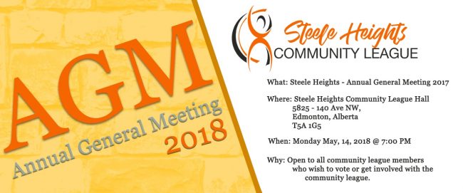 DetailsSteele Heights’ Annual General Meeting 2018 is coming up! What: Open to all community league members who wish to vote or get involved with the community league. When: Monday, May 14, 2018 at 7:00 PM, at the hall. Where: Steele Heights Community League Hall 5825 – 140 Ave NW, Edmonton, Alberta T5A 1G5